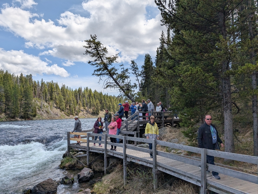 The Tetons showed off with their jagged grandeur, and I surprised everyone with some trivia: the first ascent of the Grand Teton was made possible by grasshoppers. A swarm of grasshoppers got so cold when flying over the Tetons that they dropped from the sky. Their warm bodies created divots in the ice that the mountaineers were able to use to complete their treacherous ascent. At Jackson Lake Lodge, I joined two of our guests for cocktails with a postcard view of the Tetons in the Blue Heron Lounge. The rest of the group enjoyed lunch at the Pioneer grill, rumored to have the longest lunch counter in the world, serpentining a full 210 feet!