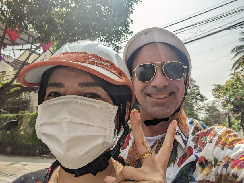 He turned the motorcycle left and we jumped onto the sidewalk. He began weaving through pedestrians just as he had through the cars. The locals just stepped aside to let us through. The westerners seemed startled or irritated and acted just like they do in the movies when you see a motorcycle chase down the sidewalk. I was in my own action film, and I was loving it.