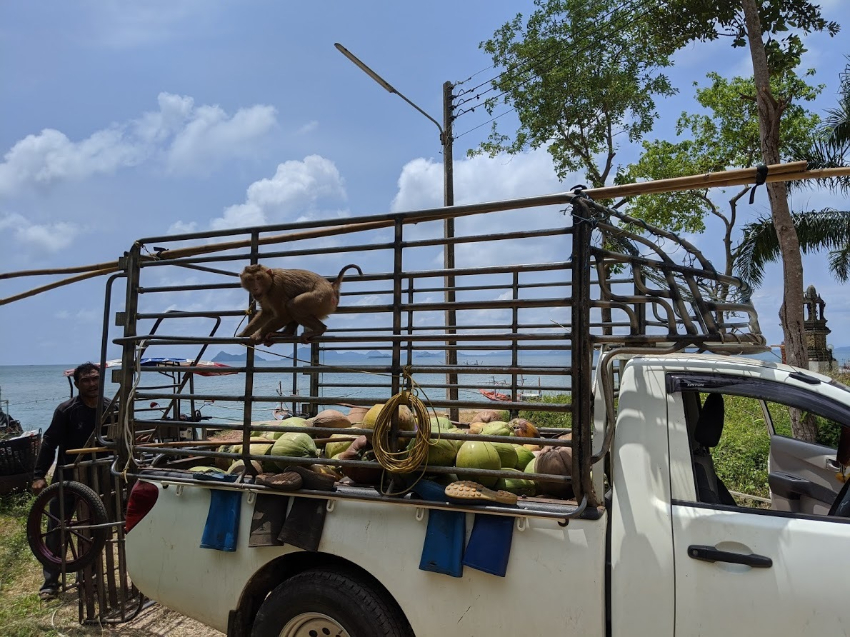 By the time we arrived at our own destination, a secluded beach resort on the coast, we quickly forgot about the stowaway monkey. The next morning I woke up and went for a walk along the beach. I saw a truck with a man tossing coconuts he’d collected into the back of his pickup. On the side was a monkey tied to a rope.